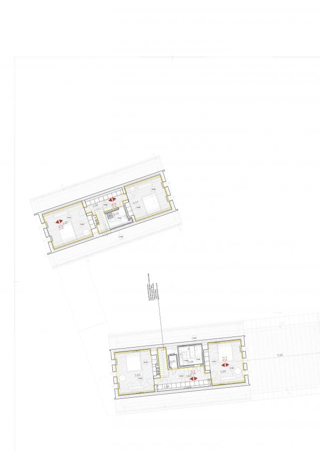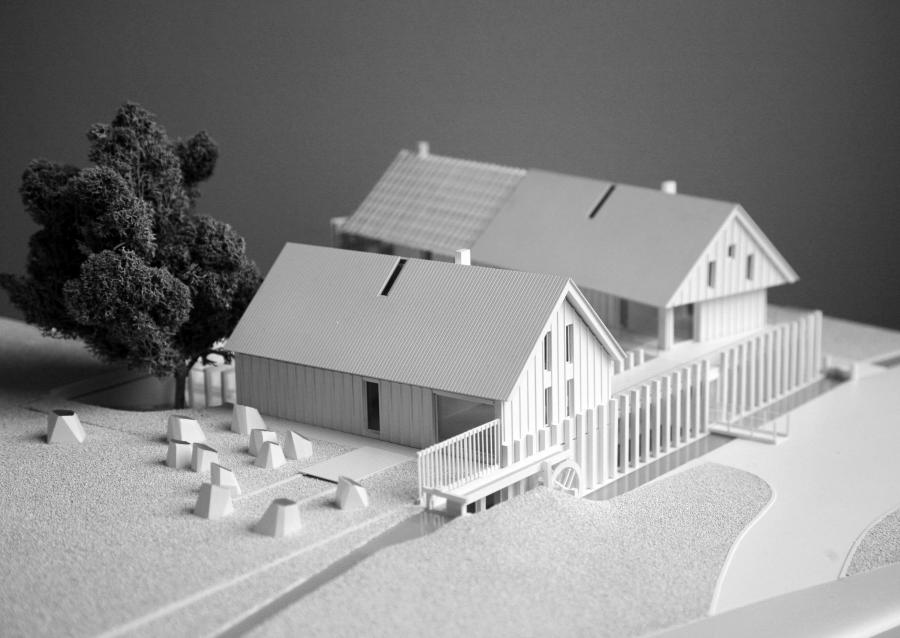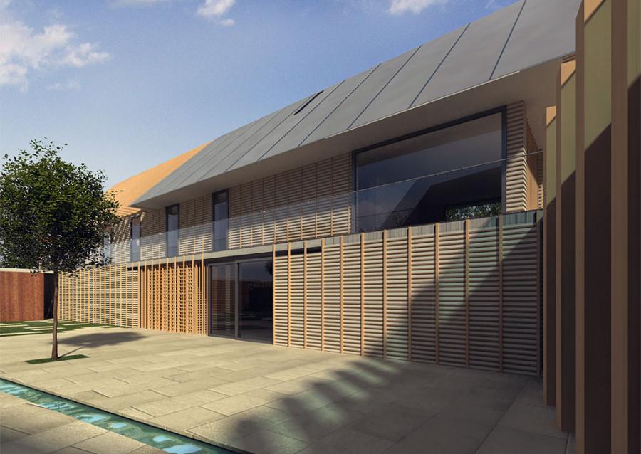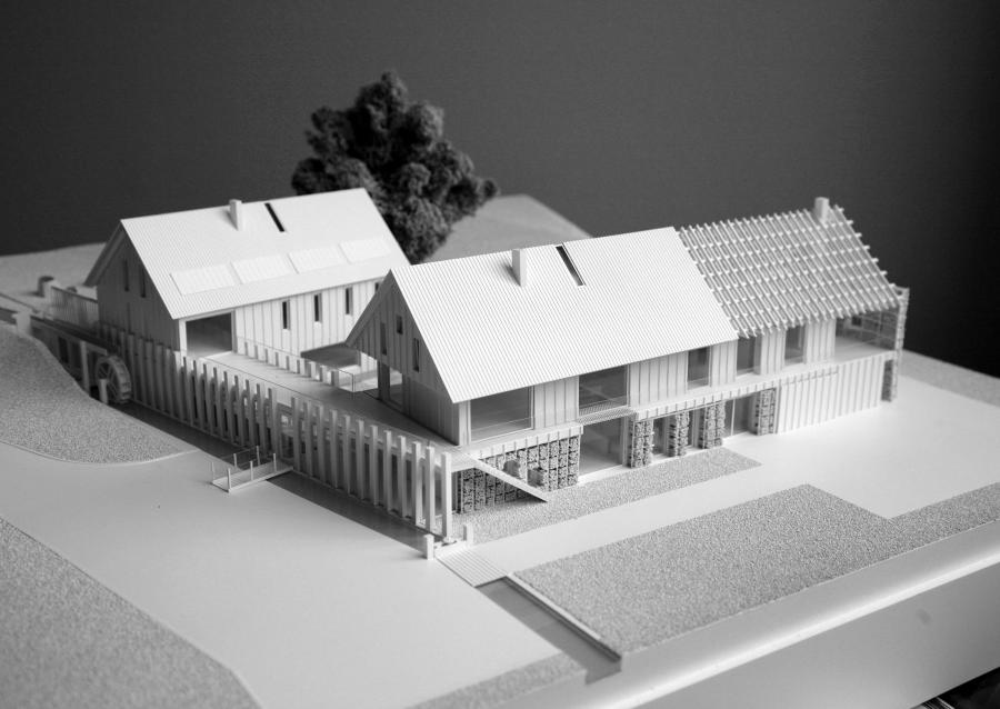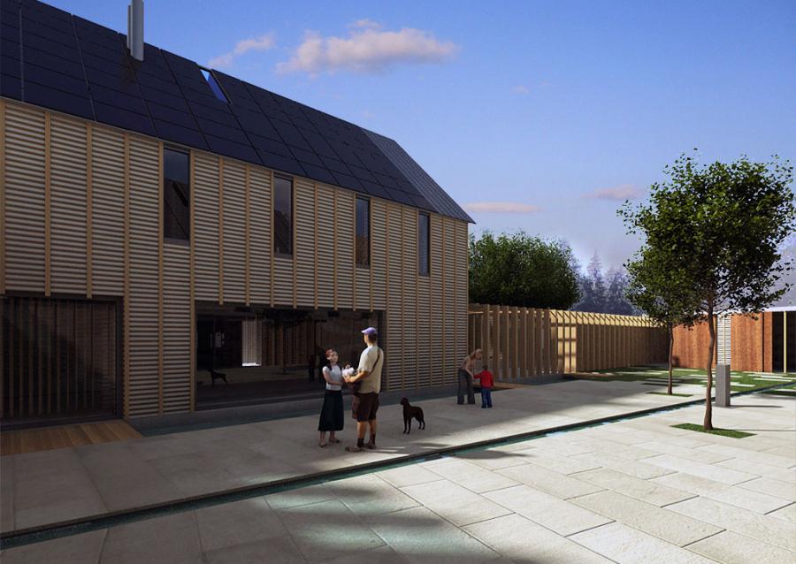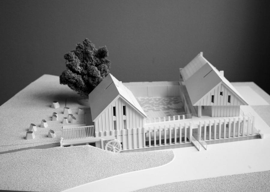 Na základě těchto indicií se v návrhu předpokládá obnova historického prostorového řešení s uzavřeným dvorcem a patrovými objekty se sedlovou střechou. V jižní a severní části atria jsou situovány patrové objekty s obytnou a ubytovací funkcí. Východní část obsahuje všechny hospodářské, technické a část skladových prostorů. Na západ je umístěn bazén v odlehčené prosklené „kolonádě“ v souběhu a kontrastu s obnoveným venkovním náhonem. Vnitřní atrium bude z cca 50% zatravněno a zadlážděno jako reminiscence starých užitkových dvorů a doplněno stromy a vodními prvky. Tvarosloví, sklon střech, základní proporce a velikosti otvorů ve štítech vychází z rozměrů standardních hrázděných konstrukcí Chebského typu. Průběžná pavlač v patře, navazující na terasy nad bazénem a hospodářskými objekty, odkazuje k výše zmiňovanému typu roubených staveb Tepelského typu s pozdější nástavbou. Většina objektů je navržena jako lehký montovaný dřevěný skelet v konstrukčním systému 2 by 4 - platform frame. Všechny exteriérové pláště, fasády, okenice a střechy budou provedeny dřevěným obkladem z Modřínových lišt, prken a roštů.