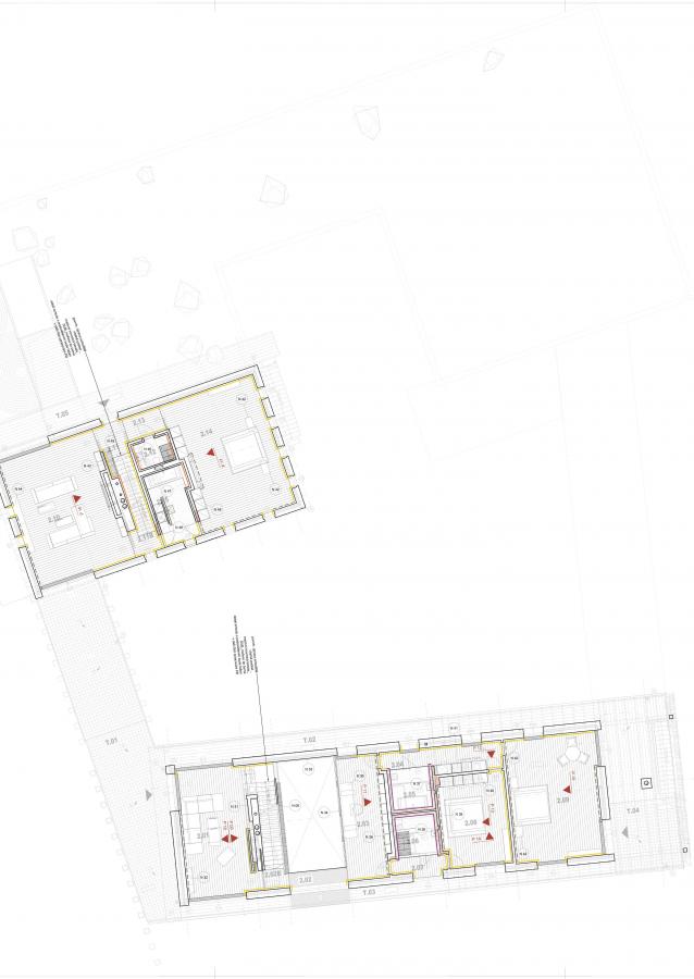 Stávající objekty mají dvě nadzemní podlaží a nejsou podsklepeny. Stavby, vyjma příčné hospodářské přístavby s pultovou střechou, mají sedlové střechy. Historické budovy byly zničeny. Stávající objekty vybudované roku 1996 jsou umístěny na původní půdorysné stopě historických základů bez zjevných tektonických vazeb nebo dobových citací.