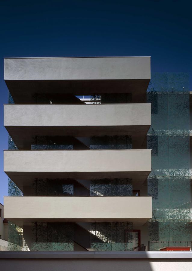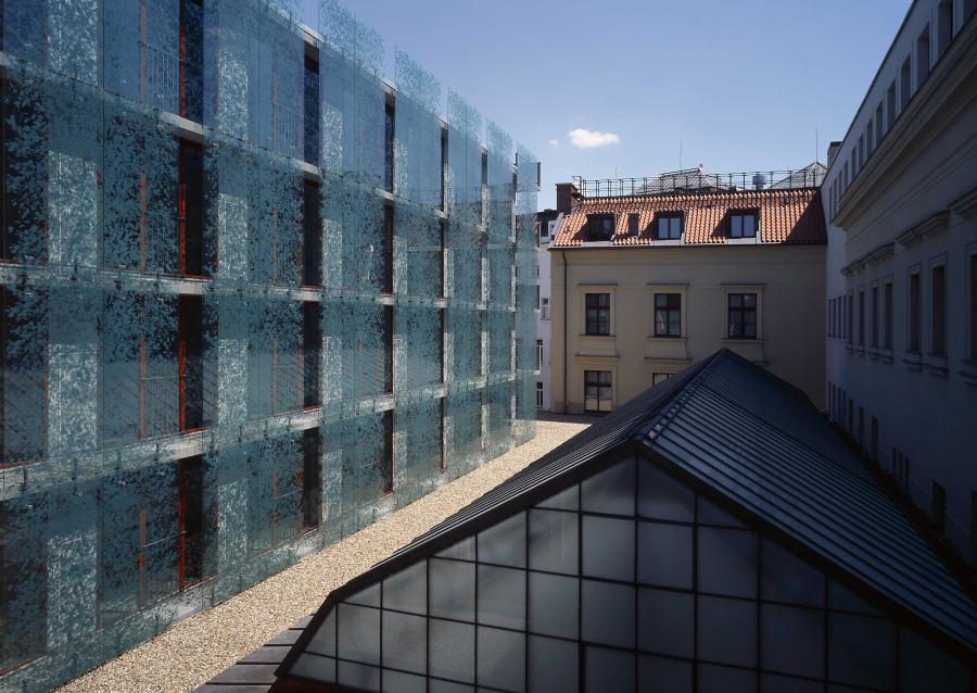 Při rekonstrukci původní budovy Hypoteční banky Království českého na luxusní pěti hvězdičkový hotel Carlo IV. (149 pokojů) byl historický objekt doplněn v prostoru vnitrobloku novou šesti podlažní dostavbou. Pro nový objekt byla zvolena jednoduchá forma kvádru fasádou s dřevěnými francouzskými okny a předsazenými velkoformátovými skleněnými deskami s vypalovaným sítotiskem v motivu zelených listů. Historická budova neorenesančního paláce má symetricky po obou stranách dvory (západní pro zásobování, východní jako příjezd k hotelu pro taxi a nový bezbariérový vstup); ve dvou suterénech novostavby je umístěna technologie a parkování.