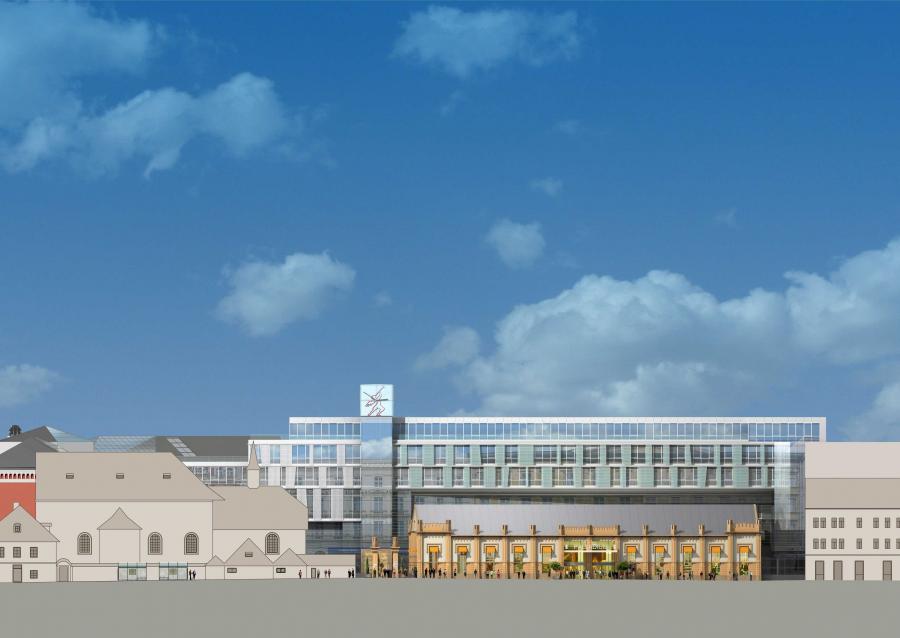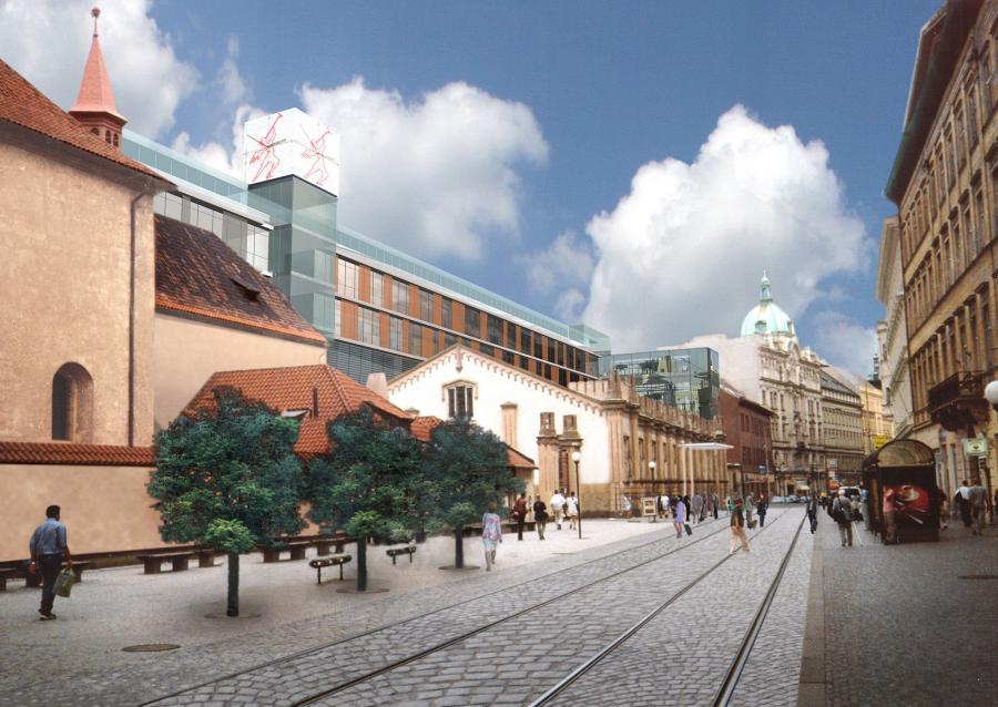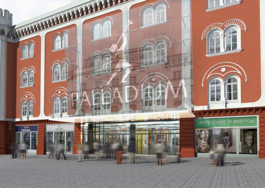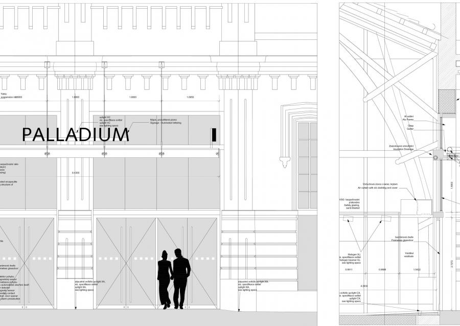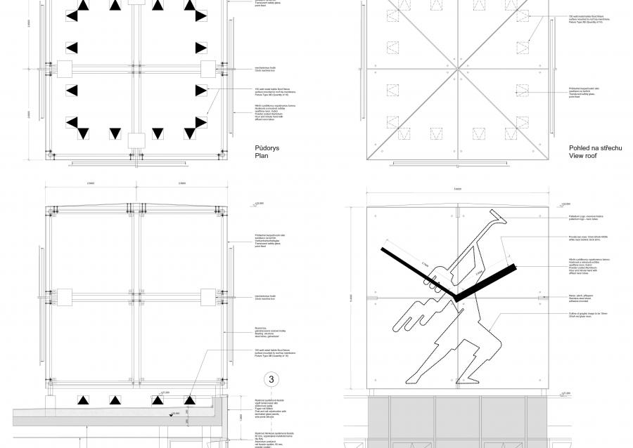 Celo prosklená skloněná plocha nad markýzou je navržena z transparentních bezpečnostních kalených skel, které jsou zavěšeny na terčích kotvených do předsazené ocelové konstrukce. Předsazená nosná konstrukce je kotvena pomocí pásových trnů do fasády tak, aby byl minimalizován zásah do fasády. V odsazené pozici od okrajů, na vrchní (cca 2m) a bočních (0,85m) stranách, jsou umístěny skleněné desky. Před plochu skleněných desek vystupují ocelové pásové trny pro umístění dočasných poutačů, sezónní výzdoby nebo plátna či LCD obrazovky pro příležitostné sportovní a kulturně-zábavné projekce. Spáry desek kromě vrchních nejsou tmeleny.