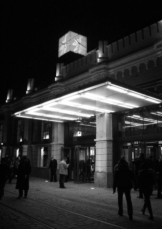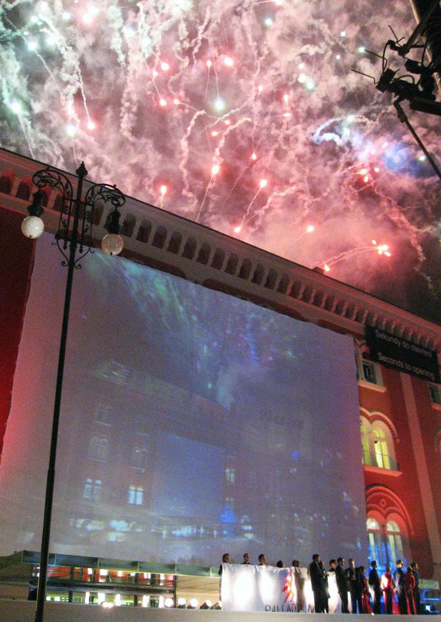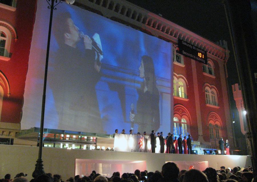 Nad konzolou markýzy je umístěna skloněná předsazená celo prosklená desková konstrukce o rozměrech cca 11x15m určená pro umístění dočasných poutačů a sezónní výzdoby nebo plátna či LCD obrazovky pro příležitostné sportovní a kulturně-zábavné projekce.