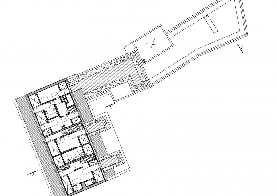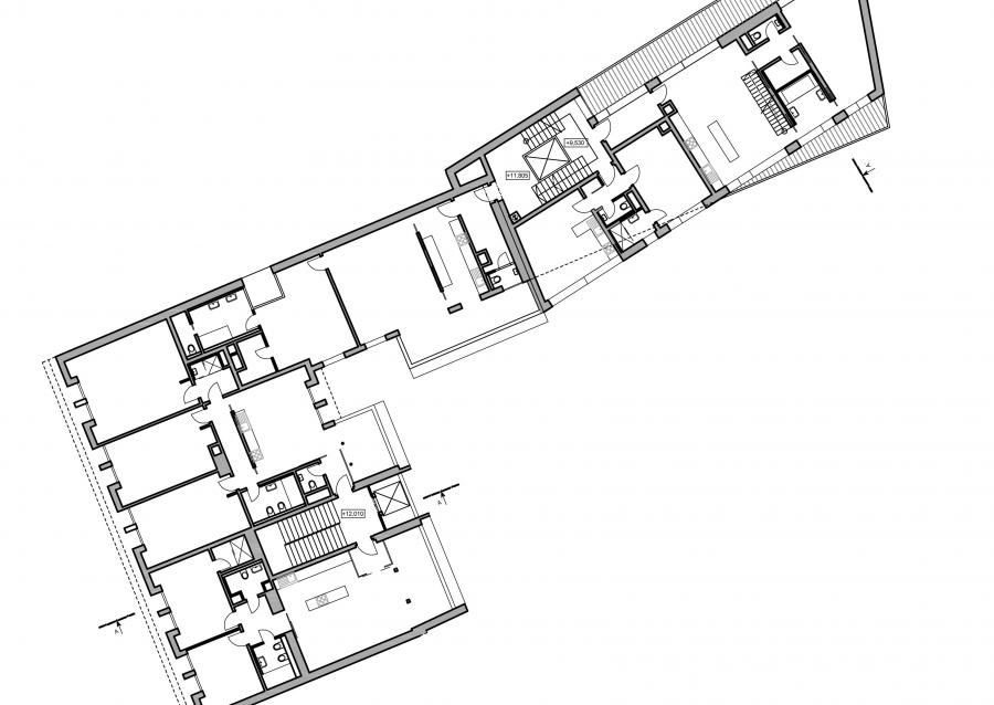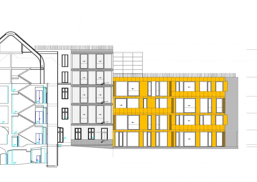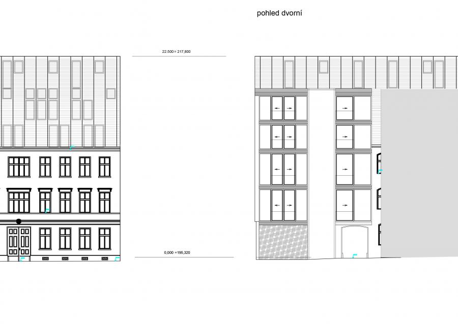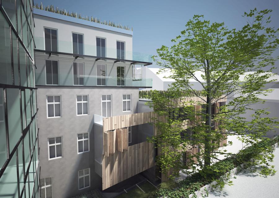 Při severní straně dvora se nachází stávající podsklepený dvoupodlažní objekt, který bude odstraněn a na jeho místě bude vybudován nový 4 podlažní bytový dům s jedním podzemním podlažním. V přízemí domu vzhledem k nedostatečným hodnotám oslunění jsou navrženy pronajímatelné kancelářské prostory se samostatným vstupem ze dvora.