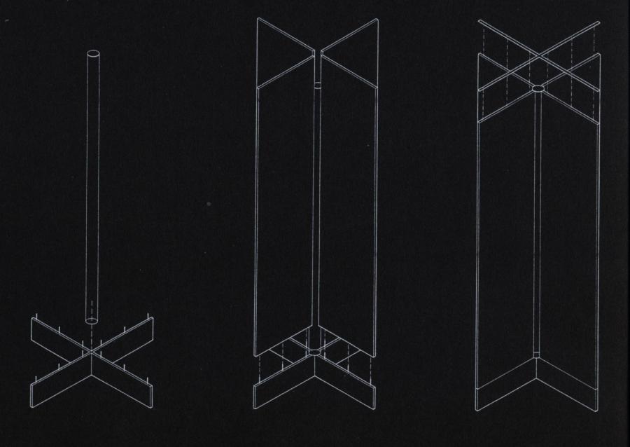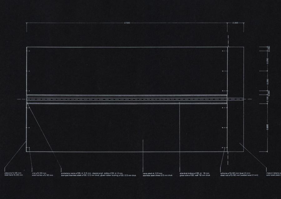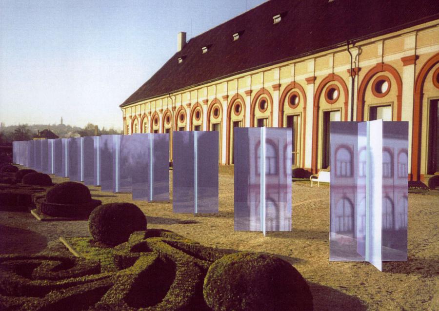 We propose to create and temporarily exihibit a series of fifteen identical freestanding sculptures. roughly two-and-a-meters tall, by one, meter square, spread linearly over an area of seventy-one meters. They will be situated between the Jizdarna, and the area of trimmed bushes and fountains, essentially dividing the garden into two poles. This will allow the objects to be seen from all points of the garden. Each sculpture will be formed by a glass core, roughly ten centimeters in diameter running vertically through the center of the structure. Adjacent to the glass will be four steel Wings that will form across around the core, making both the glass core and iťs steel enclosure visible from all sides. Optically, the contrast between the transparent glass and the opaque Steel Wings will create a unique rythm and dialog within the parameters of the garden. This will establish a foundation for the differing perceptions Oĺ space and structure in and around the site. Before the viewer can interact with sculptures physically, he must percieve the installation's optical and in conjunction with the garden's plan and structure. After this recognition it becomes obvious that the space and distance between each object are as important as the objects themselves. Therefore every physical change in position the viewer makes in the garden changes the relationship to both the installation and to his architectural environment. Thus the garden becomes not not only a platform for seeing the obvious, but a machine for perceiving the subtleties that exist beteen architecture and space. In conclusion, we feel that this project will not only add to the landscape of Prague Castle, but Will be an important public sculpture for the city of Prague. We hope that after our installation has been exhibited the terrace garden will continue to be a place where artists and architects can create and exhibit new works. This is an innovative and significant opportunity to continue the evolution of the Castle, by adding our generation's voice to those of generations past. As Josip Plečnik understood so well, the true beauty of the Castle is its capacity not only to serve as a symbol of the Czech nation politically, but culturally as well. The transformation of the terrace garden from a simple vantage point to a vibrant space for art will maintain the tradition of Plečnik and others Who have left their architectural and artistic legacy for us to apprecia;te.