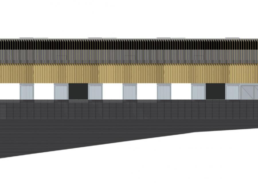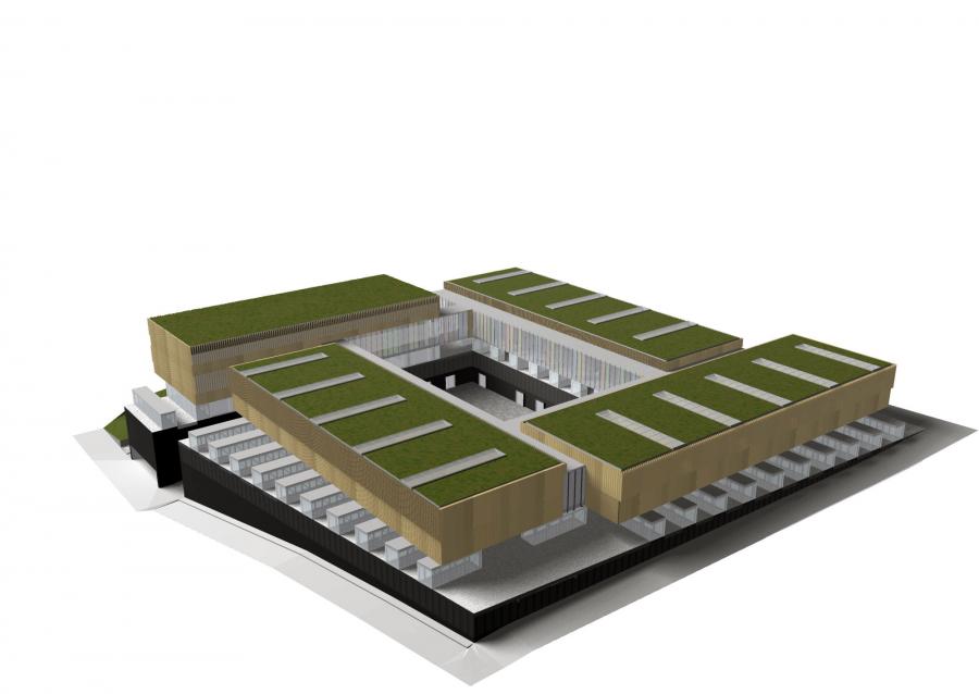 Přes objemnou hmotu školních dílen vytínající ve svahu prostory seskupené do neuzavřeného prstence okolo centrálního dvora jsou nakladeny dvě řady velkoprostorových světlíků. Na nich pak v kolmém směru spočívá čtveřice podlouhlých boxů atelierů a učeben.