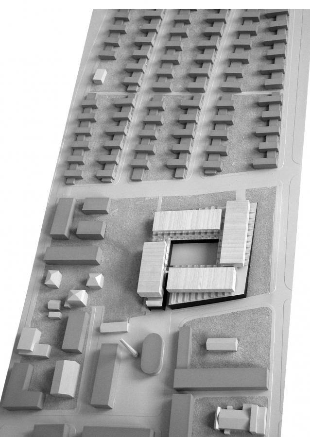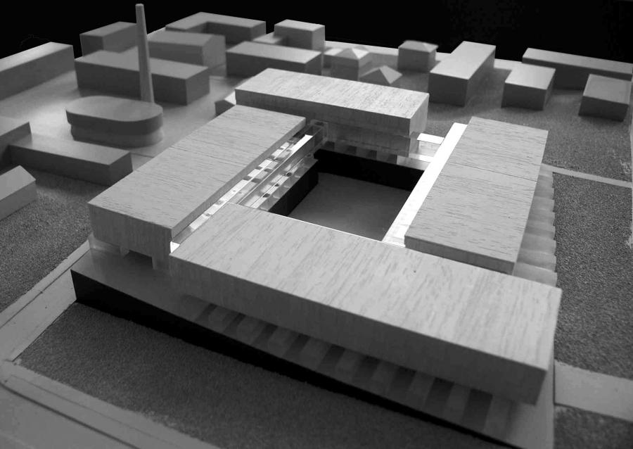 Použití konceptu klasické klášterní dispozice má více souvislostí. Jedná se o všem srozumitelné uspořádání, mělo by v návštěvníkovi budit pocit klidu a důvěry. Přináší světlo a vzduch do hloubky dispozice, šetří a koncentruje komunikace. Těžištěm dispozice se zde stává víceúčelový prostor dvora. Dílenská práce, komunikace, vystavování prací, relaxace, společenské akce – tím vším je možné tuto „halu pod otevřeným nebem“ naplnit. V neposlední řadě je prezentovaná kompozice i tak trochu ulitou – svět malého města a prostředí umělecké vysoké školy nejsou vždy kompatibilní a obě substruktury mohou možnost uzavřenosti vítat. Pěší průchod podél novostavby je proto záměrně ponechán vně stavby, aby nenabourával koncentrovanost a klášterní intimitu školního provozu.