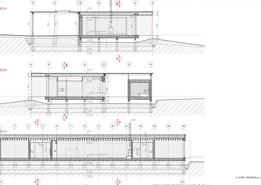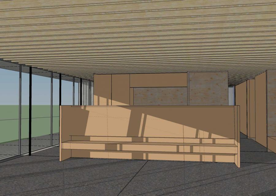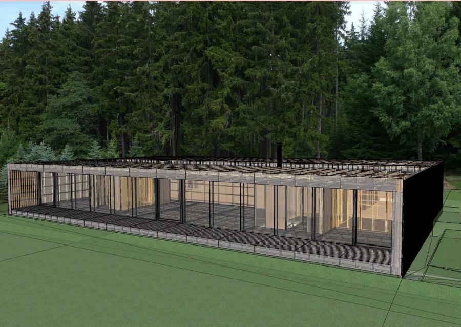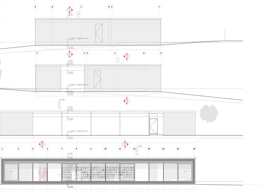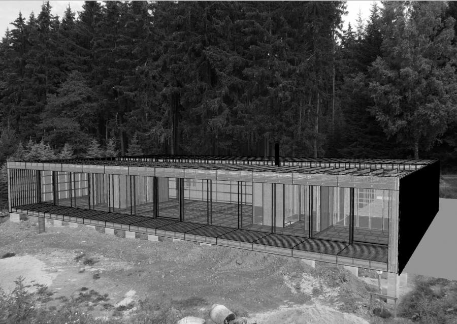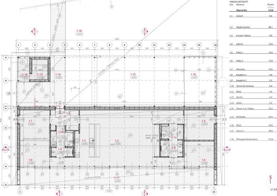 Dispozice je rozdělena dvěma bloky se zázemím do příčného trojtaktu, kde vždy na koncích se nachází klidové zóny pokojů a pracovny. V centru domu je společný obytný prostor s jídelnou a kuchyní. Instalační a koupelnová jádra s šatnou jsou přístupná vždy oboustranně.