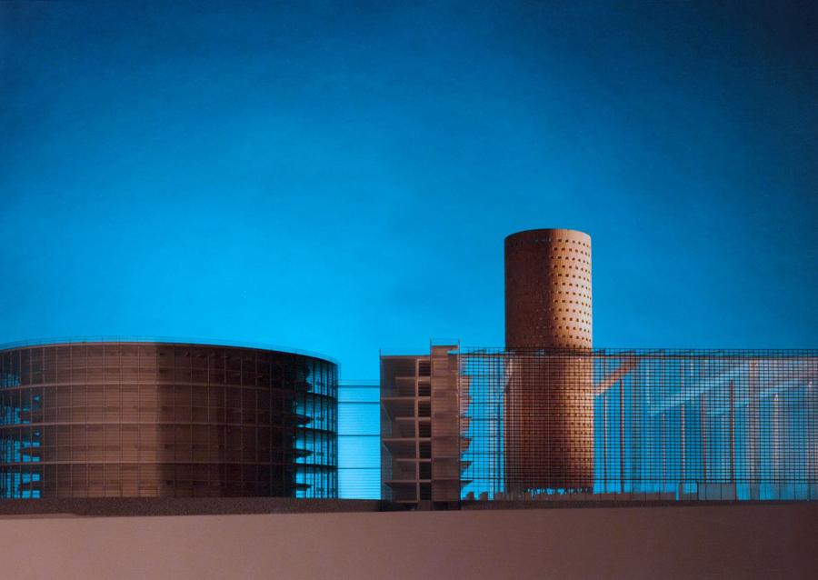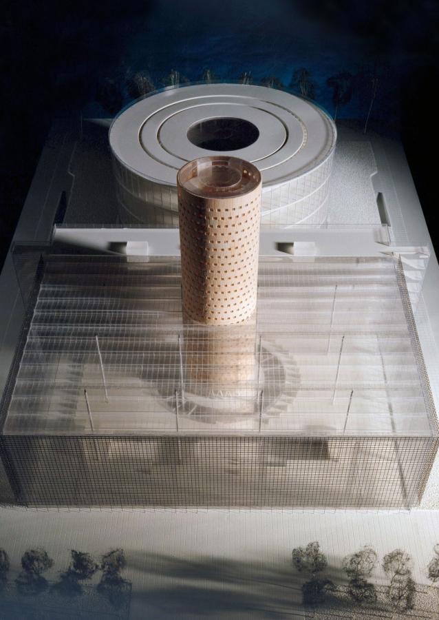 Koncept knihovny je prostý. Transparentní hala je rozdělena „ stěnou knih“ na čtenářský sál a administrativní část. Do této struktury jsou vloženy dvě válcové věže, čítárny. Štíhlá je vztyčena před stěnou knih. Široká je položena do volného prostoru za halou. Používáme klasický systém tří prvků: štíhlý válec – kvádr – široký válec.