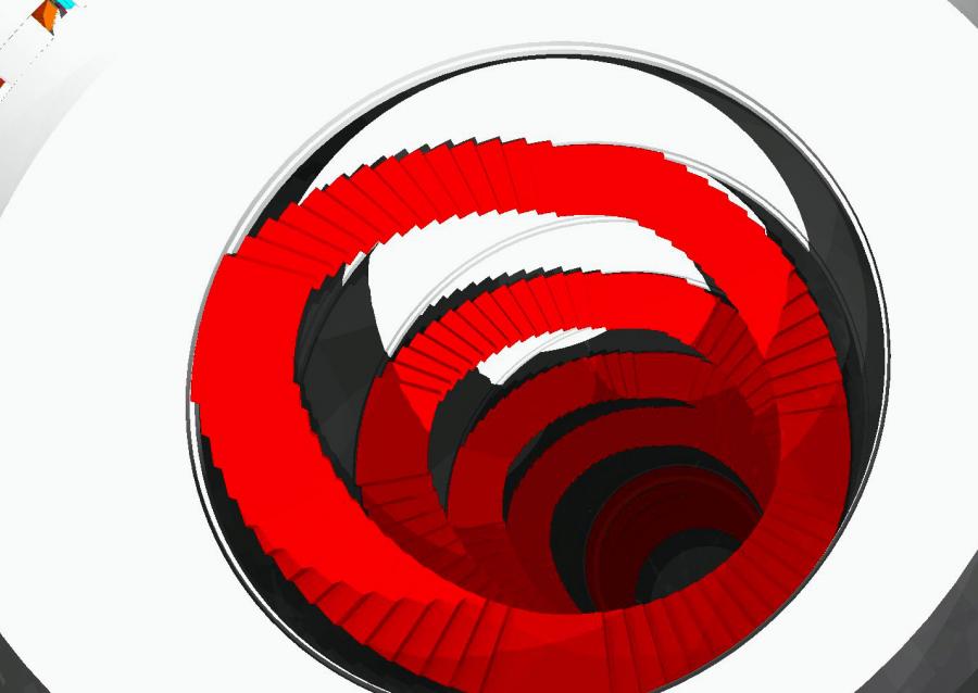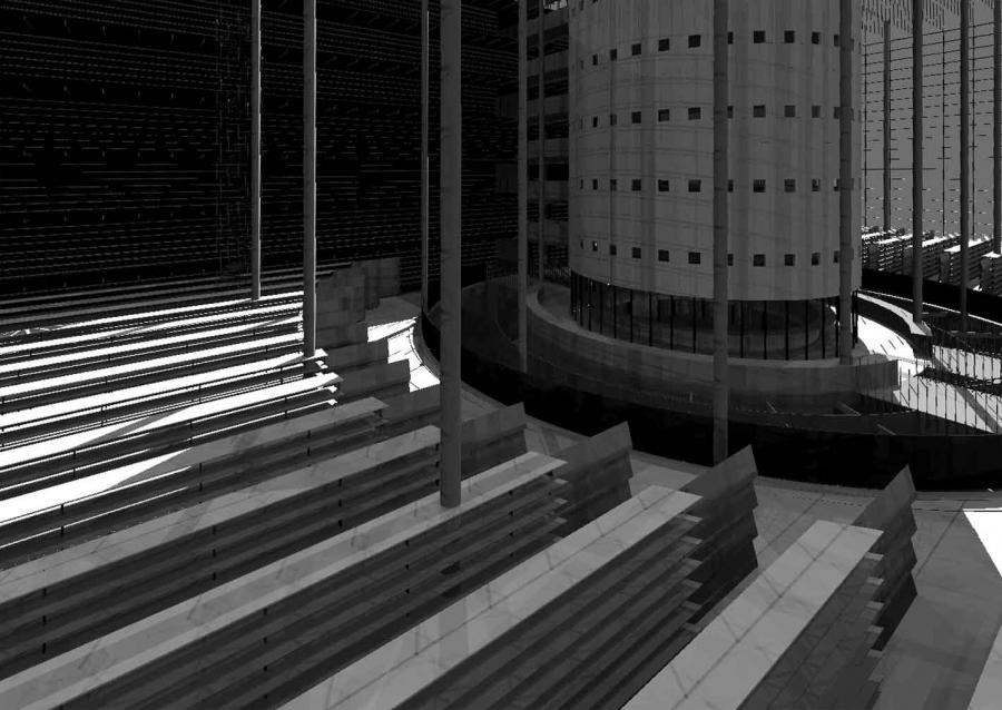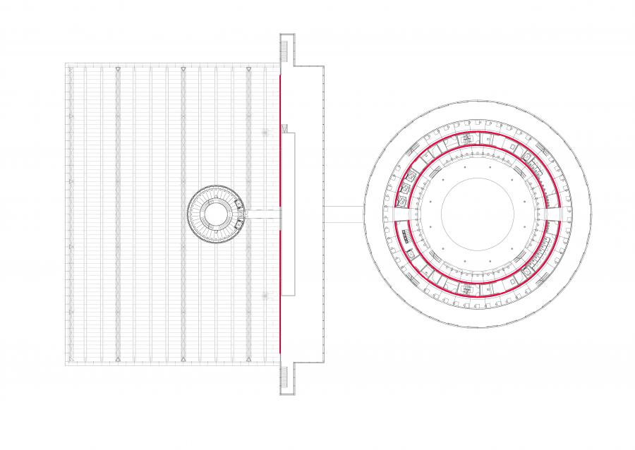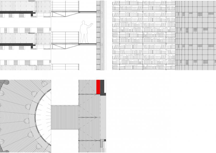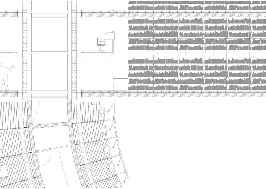 „Stěna knih“ tvoří dominantu čtenářského sálu – odvolání na klasickou knihovnu je zřejmé. Staré knihovny často používaly toto řešení. Kruhová schodiště propojující ochozy jen potvrzují tuto symboliku. Stavba dává jasný signál – jsem knihovna a navazuji na tradici.