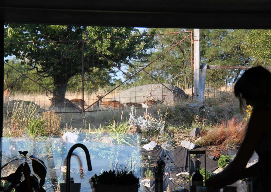 K objektu je přistavěna lehká ocelová rámová konstrukce plnící funkci odstavného stání. Pod ní lze umístit sklad sportovního vybavení a venkovního nábytku. Tuto plochu lze uzavřít jednoduchou mříží umístěnou po obvodě plochy. V sousedství je umístěna terasa s opěrnou kaskádovou záporovou stěnou pod přilehlou komunikací. Kryté terasy kolem domu jsou provedeny, obdobně jako dřevěné prvky fasády, z modřínu.