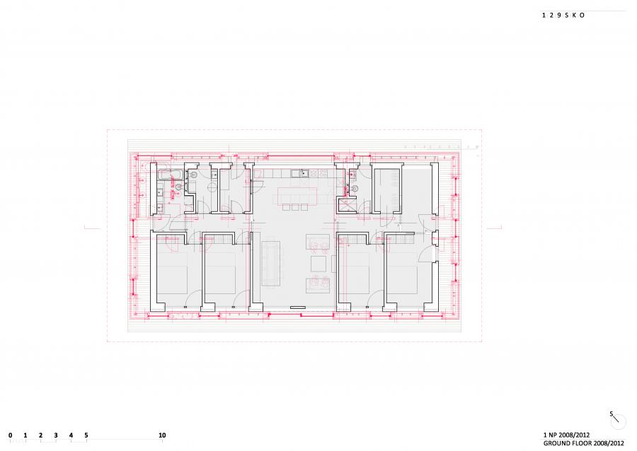 Dispozice je řešena jako trojtrakt, kde střední část slouží jako společný obytný prostor s kuchyní a zároveň provozně i akusticky odděluje prostory ložnic s příslušenstvím.